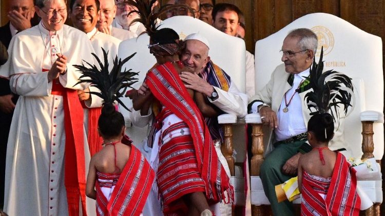 La troisième image est celle du Président de la République José Manuel Ramos-Horta qui, à la fin des discours officiels dans le palais présidentiel de Dili, Timor oriental, s'est penché pour aider le Pape à ajuster les pieds dans son fauteuil roulant. Dans ce pays, le plus catholique du monde, la foi est un élément identitaire fort et le rôle de l'Église a été déterminant dans le processus qui l’a conduit à l'indépendance vis-à-vis de l'Indonésie.